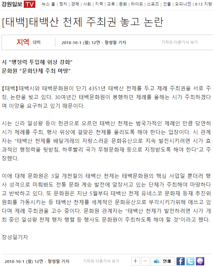 [태백]태백산 천제 주최권 놓고 논란 태백문화원 2018-12-13 18:08:30 view : 720 목록 이전글단기 4351년 태백산 천제2018.12.13 다음글[태백]태백산 천제 역사. 문화 가치 주목2018.12.13