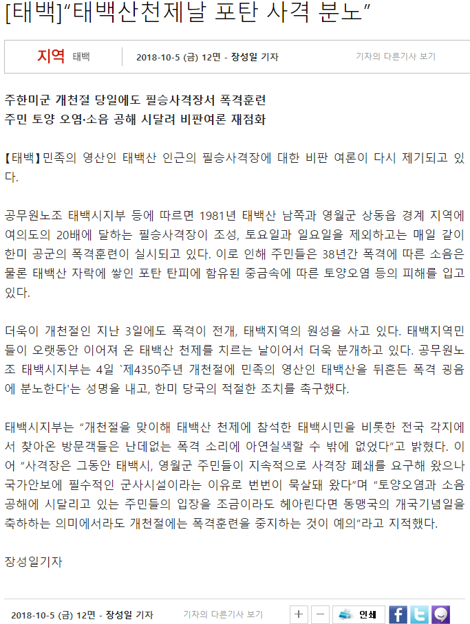 [태백]"태백산천제날 포탄 사격 분노" 태백문화원 2018-12-13 18:10:28 view : 757 목록 이전글[태백]오늘 태백산 천제 학술세미나·사진 전시회2018.12.13 다음글단기 4351년 태백산 천제2018.12.13