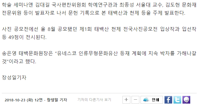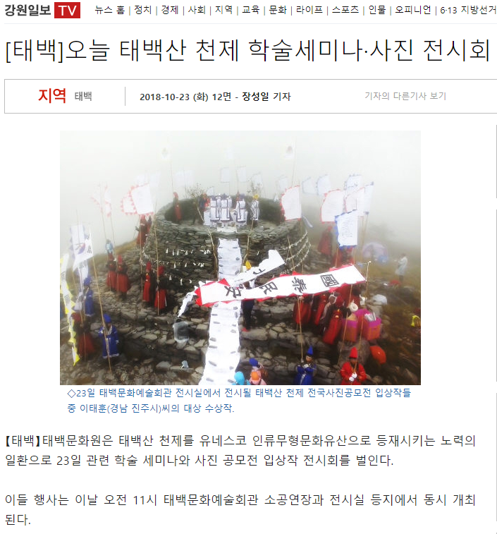 [태백]오늘 태백산 천제 학술세미나·사진 전시회 태백문화원 2018-12-13 18:12:22 view : 735 목록 이전글[태백]태백산 천제 유네스코 등재 100만 서명운동2018.12.13 다음글[태백]"태백산천제날 포탄 사격 분노"2018.12.13