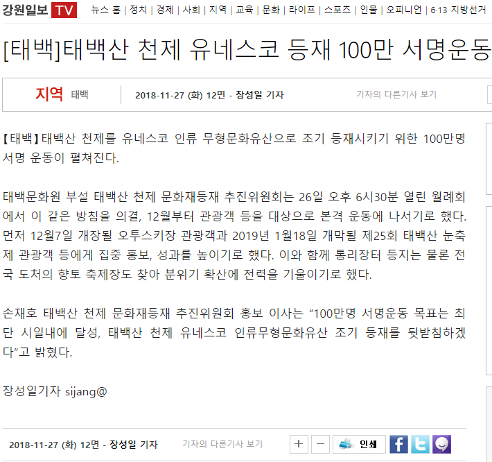 [태백]태백산 천제 유네스코 등재 100만 서명운동 태백문화원 2018-12-13 18:13:38 view : 780 목록 이전글[태백] 태백산 천제 행차 무산에 지역단체 반발2020.06.29 다음글[태백]오늘 태백산 천제 학술세미나·사진 전시회2018.12.13