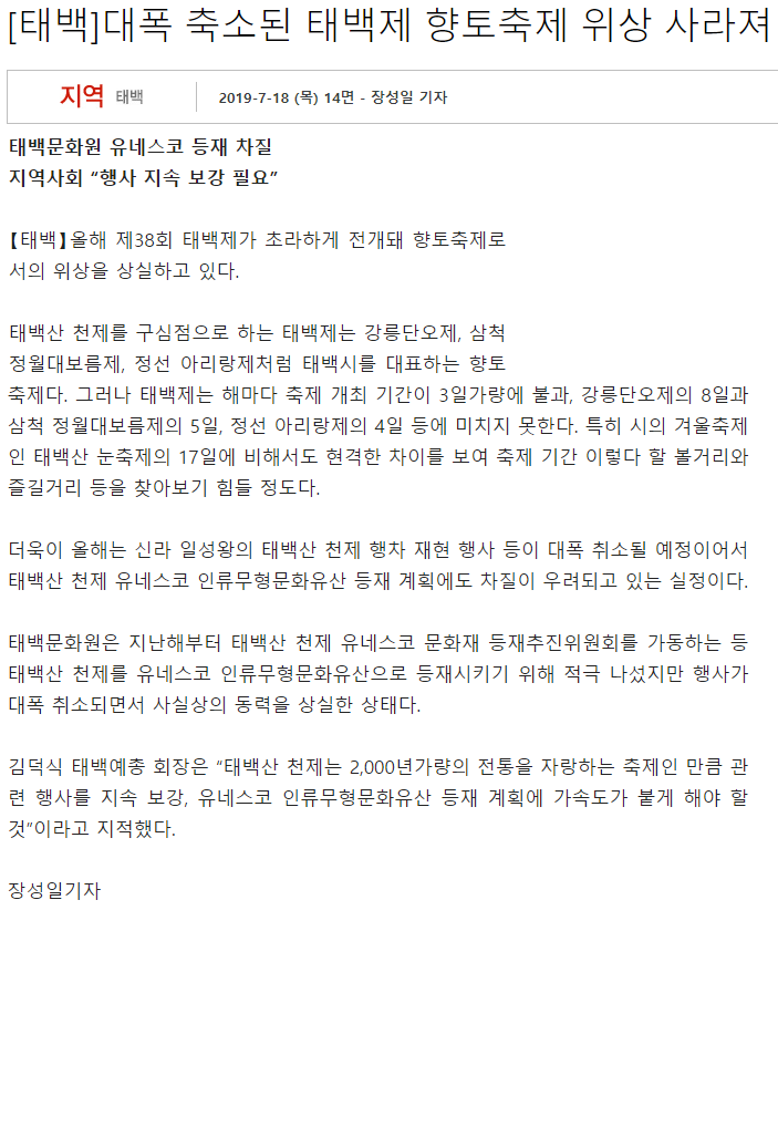 [태백] 대폭 축소된 태백제 향토축제 위상 사라져 관리자 2020-06-30 09:04:40 view : 685 목록 이전글[태백] "신라 때 태백산 천제서 삼국통일 소원"2020.06.30 다음글[태백] 태백산 천제 행차 무산에 지역단체 반발2020.06.29