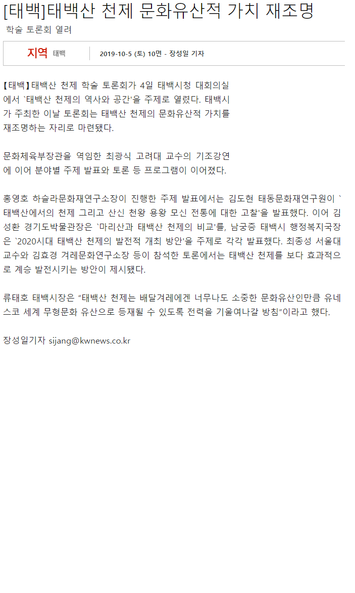 [태백] 태백산 천제 문화유산적 가치 재조명 관리자 2020-06-30 09:09:26 view : 908 목록 이전글[태백] 태백문화원 부설기구 운영 놓고 논란2020.06.30 다음글[태백] 태풍 '미탁'에 태백제 행사 줄줄이 차질2020.06.30