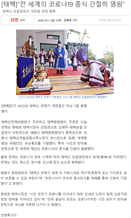 [태백] "전 세계의 코로나19 종식 간절히 염원" 태백문화원 2020-10-08 15:16:10 view : 1292 목록 이전글'하늘이 열린 날' 개천절...태백산 천제 봉행2020.10.08 다음글태백시, 태백산서 개천절 천제 봉행2020.10.08