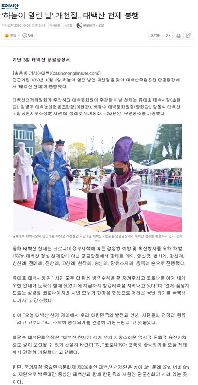 '하늘이 열린 날' 개천절...태백산 천제 봉행 태백문화원 2020-10-08 15:17:32 view : 1308 목록 이전글[포토뉴스] 단기 4354년 태백산 천제 봉행2022.02.22 다음글[태백] "전 세계의 코로나19 종식 간절히 염원"2020.10.08