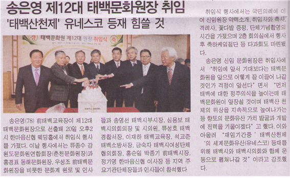 송은영 제12대 태백문화원장 취임 '태백산천제' 유네스코 등재 힘쓸 것 - 태백신문 (2017. 3. 24) 태백문화원 2018-05-08 18:40:58 view : 675 목록 이전글[태백] 태백산 천제 유네스코 등재 추진 - 강원일보(2017.3.21)2018.05.08