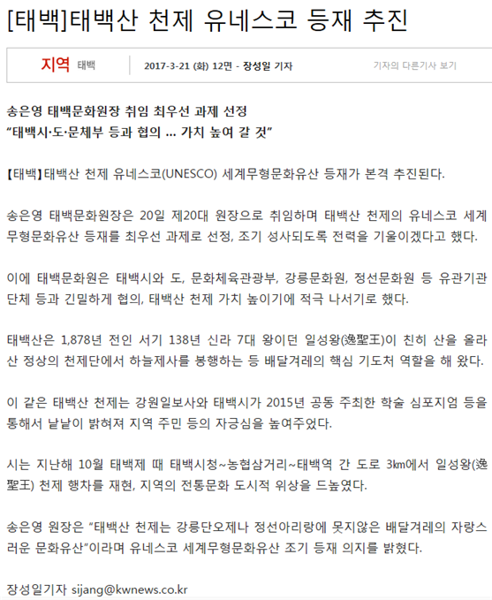 [태백] 태백산 천제 유네스코 등재 추진 - 강원일보(2017.3.21) 태백문화원 2018-05-08 18:46:47 view : 731 목록 이전글[태백] 천제 참가자 제주 음복 - 강원일보 (2017. 8. 25)2018.05.08 다음글송은영 제12대 태백문화원장 취임 '태백산천제' 유네스코 등재 힘쓸 것 - 태백신문 (2017. 3. 24)2018.05.08