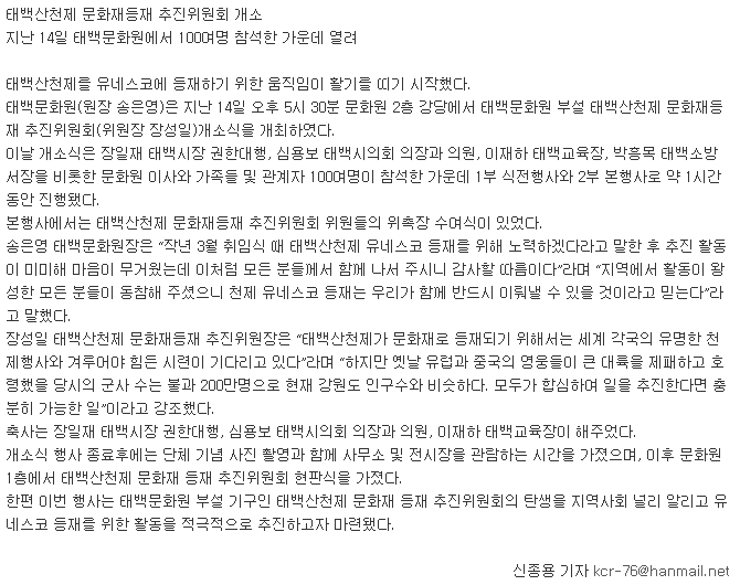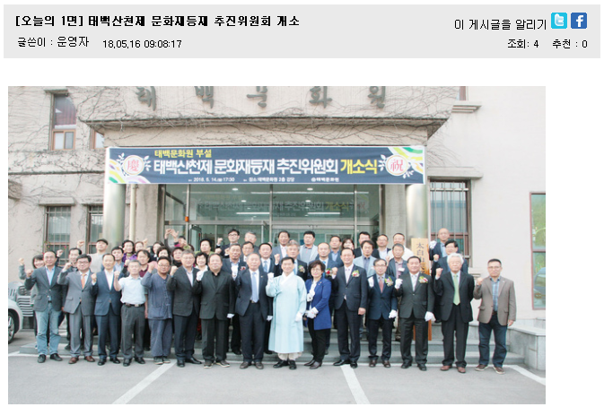 [오늘의 1면] 태백산천제 문화재등재 추진위원회 개소 - 태백교차로(2018.5.16) 태백문화원 2018-05-16 17:10:25 view : 773 목록 이전글[포토뉴스]태백산천제 세계무형문화유산 등재 추진위 개소 - 강원일보 (2018.5.16)2018.05.16 다음글[포토뉴스] 태백산 천제 봉행 - 강원일보 (2017. 10. 9)2018.05.08